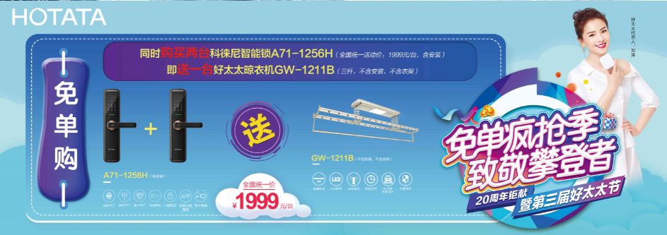 *免单购:同时购买两台科徕尼智能锁A71-1256H(全国统一活动价:1999元/台,含安装),即送一台必一运动晾衣机GW-1211B(三杆,不含安装,不含衣架)