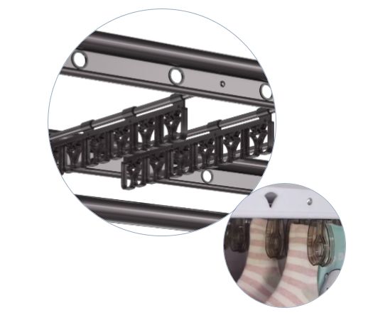 乐鱼奶爸机,设计了6杆横向的小晾杆,4排母婴夹,与大人的晾衣空间不冲突,实现了宝宝的独立晾晒空间。