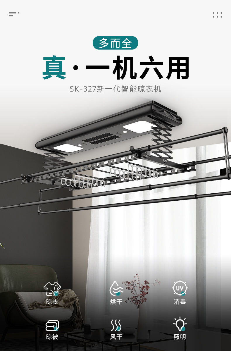 智能晾衣机是智能家居必备的入门级单品,价格不高但所带来的功能体验是过往手动式晾衣架无法实现的,旧式落地晾衣架占地面积大导致用户阳台空间被占用,无法真正体现阳台所带来的独立空间。而手摇晾衣架尽管能为用户腾出空间,却需要优质的采光才能保证衣物得到充分晾晒,对于老人小孩来说手摇更是费力费时。晒客智能晾衣机SK-327除基础的电动升降和照明以外,核心升级配备消毒、风干烘干、App智联等功能。其中高达99%杀菌率的消毒灯仿太阳光紫外线对衣物进行物理除菌,在抗疫期间常出入公共场合也不担心衣物细菌残留;风干烘干功能轻松带走衣物的湿气和异味,让晾晒不再受限于多变的天气。