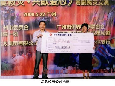 5月22日,由广东南方电视台卫星频道主办,广东乐鱼集团协办的《抗震救灾•共献爱心》粤剧赈灾义演在南方剧院举行,乐鱼集团董事长沈汉标先生代表集团为灾区捐款50万元,此次赈灾义演活动,共募集善款120多万元。这些善款将通过广州市慈善会全额捐往灾区。